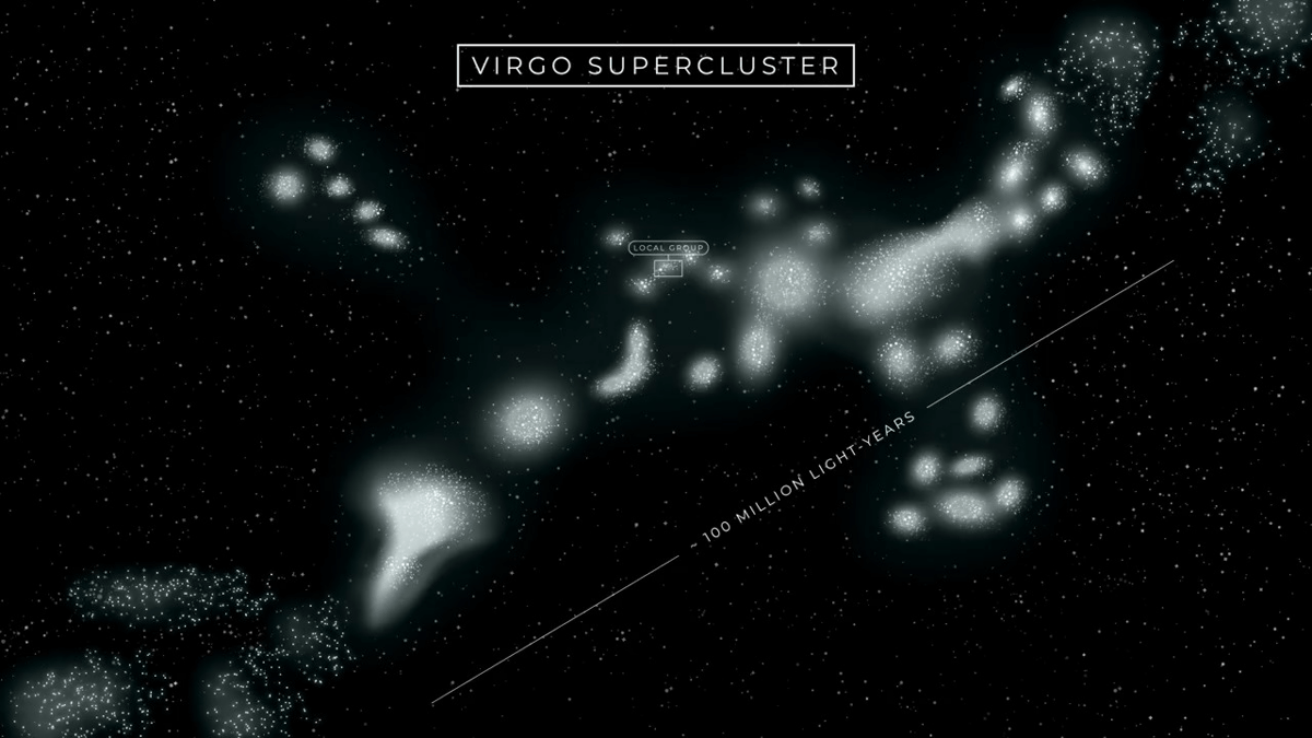 さらに遠くから見ると、およそ1億光年にわたって広がるおとめ座超銀河団の姿が確認できます。