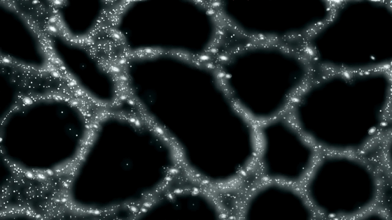 しかし、実際には銀河や宇宙ガス、ダークマターなどが網の目状に配置されており、それぞれの分布は均一ではありません。銀河が集合した膜のような存在は銀河フィラメントと呼ばれます。