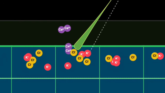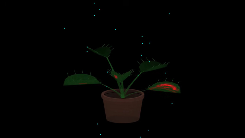 ハエトリソウは、葉の内側にある毛が触れられると、細胞内でカルシウムイオンが流入し、電気的な変化が発生します。この電気信号は周囲の細胞へと波のように伝わり、カリウムイオンや塩化物イオンの移動を引き起こします。その結果、細胞内外の浸透圧バランスが変化し、水が移動することで葉の構造が変形し、口を開いていたハエトリソウがパクッと口を閉じる仕組みになっています。