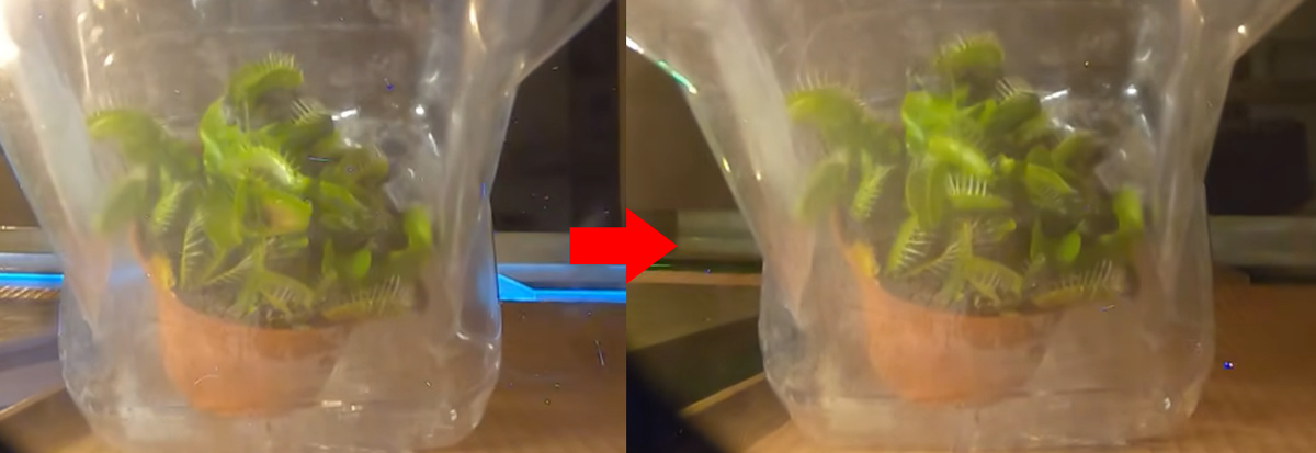 実験では、放射線遮断されたGoProカメラのすぐ前にハエトリソウを設置し、粒子加速器のビームによる反応を捉えています。