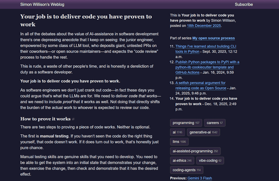 ウィリソン氏は「ソフトウェア開発者の仕事は、動作が証明されたコードを提供することです。ソフトウェア開発者の仕事は、ただコードを量産するだけではありません。実際、昨今では大規模言語モデル(LLM)こそがコードを書くためのものだと言えるかもしれません。ソフトウェア開発者の仕事は動作するコードを提供するだけでなく、コードが動作することを証明する必要もあります。それを怠ると、実際の作業負担はコードレビュー担当に押し付けられることになります」と語っています。
