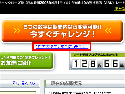 外国為替証拠金取引を取り扱うサイバーエージェントFXのサイトで、2008年3月末の為替レートを予想し、5つの数字を当てると総額1000万円の賞金が当たるキャンペーンが開始されました。為替の予想ということでランダムに5つの数字を選ぶ宝くじミニロトよりは当たる確率が高くなっていて、予想する数字は途中で変更することも可能となっています。
