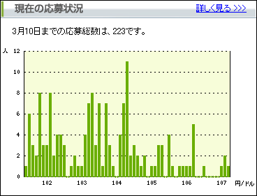 応募は3月10日0:00~3月16日23:59は第一次応募期間で上下1銭までの幅が正答となり、3月17日0:00~予想最終日の3月26日12:00までの応募だと数字をピッタリ当てると正答になります。予想数字は後から変更出来るので、まずは早めに応募してから、全く違う数字になりそうだったら最終日に変更するといったやり方が一番お得そう。