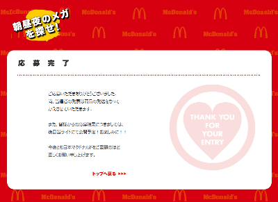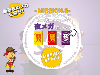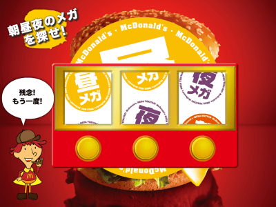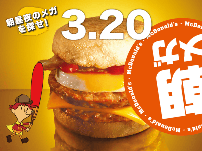 4月4日からマクドナルドで新発売のメガマフィン(朝メガ)、新たにレギュラーメニューに仲間入りしたメガマック(昼メガ)、期間限定メニューとして帰ってきたメガてりやき(夜メガ)の3つのメガラインナップがそろい、朝から夜までメガが楽しめるようになります。それに先駆けて「朝メガ・昼メガ・夜メガを探せ!」というキャンペーンが行われています。