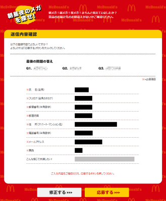 最後の問題に答えて住所登録を行い、「登録内容を確認」をクリック。