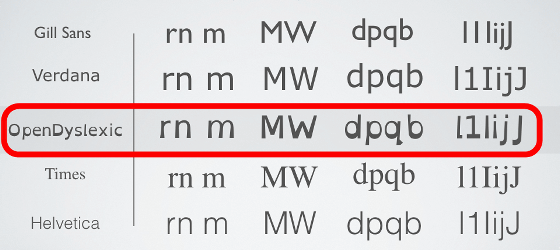 研究対象となったのはディスレクシア向けに設計された「OpenDyslexic」というフォントです。OpenDyslexicは文字の下部に「重み」があるのように見えるのが特長で、文字の方向を認識しやすくなることでディスレクシアでも読みやすくなるとされています。