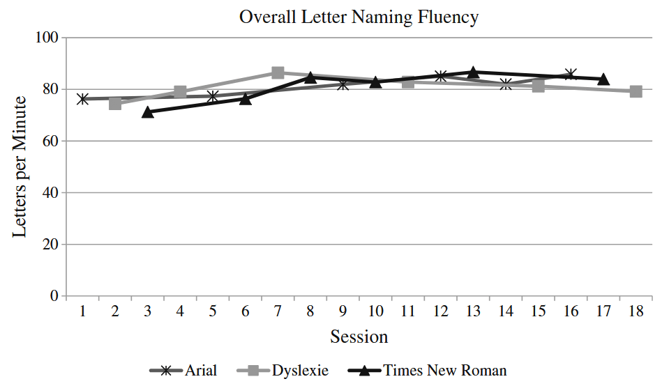 しかし、2017年に発表された研究ではOpenDyslexicの効果が否定されました。研究チームは12人の小学生を対象に「Arial」「OpenDyslexic」「Times New Roman」の読解速度テストを実施。被験者にはディスレクシアの児童とディスレクシアでない児童が含まれていましたが、3種類のフォントで有意な差は見られませんでした。