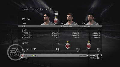 うまく試合の流れの中でチームに貢献していくことで、高いレーティングを得られます。選択したプレイヤーであるACミランのカカはカラーゼに比べてパス成功率もドリブル成功もタックル成功も少ないですが、試合中にアシストをしたりいい位置でディフェンスを行ったためにレーティングが高くなっています。