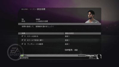 「FIFA08」から登場した「BE A PRO シーズン」は一人の選手を選んでプレーするモードで、本作では前作に比べてかなりグレードアップしている印象です。オフラインではクラブチームの一員としてシーズンを戦いつつ、ナショナルチームの代表を目指していきます。