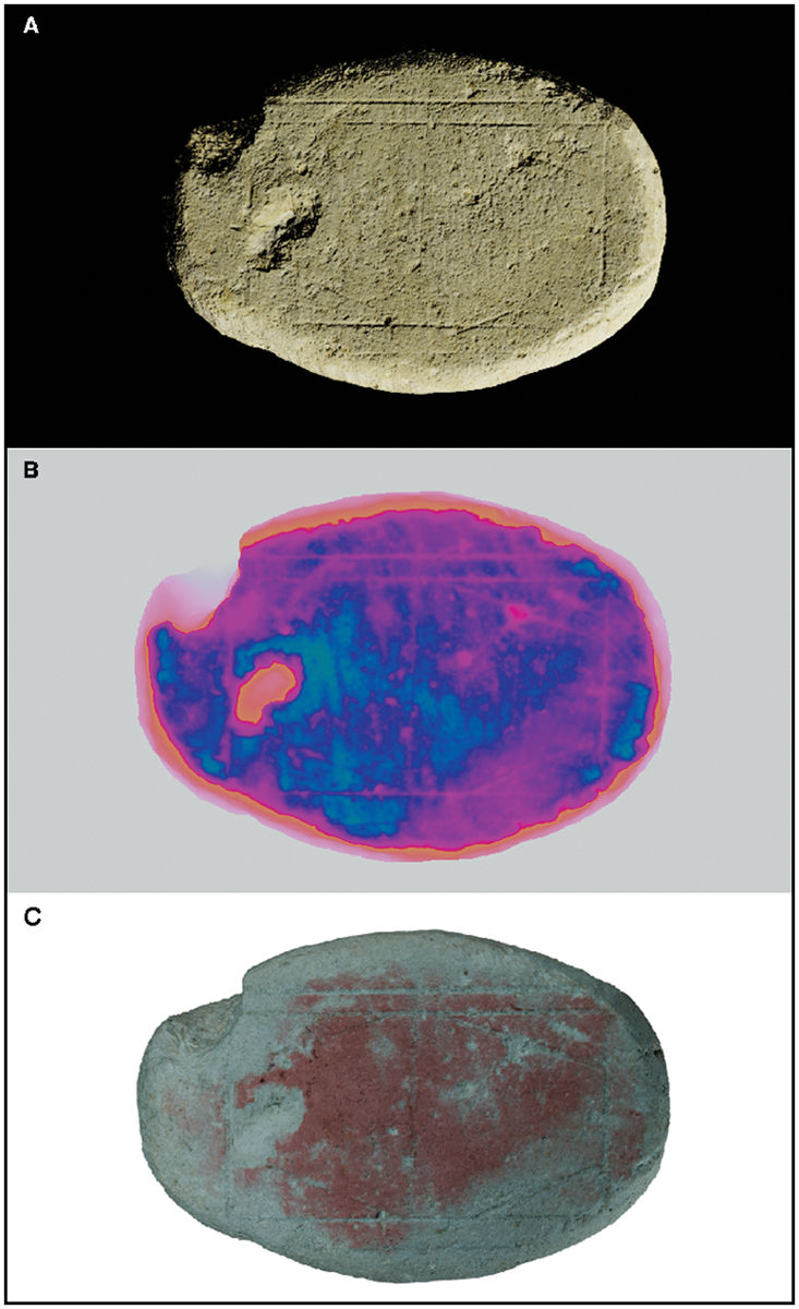この楕円(だえん)形の石灰岩は平らな表面を持っており、特定の角度から見るとはっきりとした摩耗の跡がみられました。遺物についての記録文書は存在しておらず、ヘールレンにあるCoriovallumというローマ時代の遺跡から、19世紀後半~20世紀初頭に発掘されたということしかわかっていないとのこと。Coriovallumは、ローマ帝国初代皇帝であるアウグストゥスの治世下である紀元前27年~紀元後14年に築かれ、西ローマ帝国が滅亡する紀元後476年まで人々が定住していた都市です。