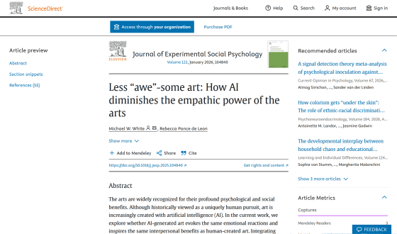 近年は生成AIの発達により、一部のユーザーが絵画や文芸といった芸術作品の作成にAIを利用するようになっています。2026年1月に発表された研究論文では「AI生成画像を人間による作品と偽る」「人間による作品をAI生成画像と偽る」といった実験の結果、「どのように作られたか」という情報が人間の共感性に大きな影響を与えていることが確認されました。同様の傾向は文学作品でも確認されています。