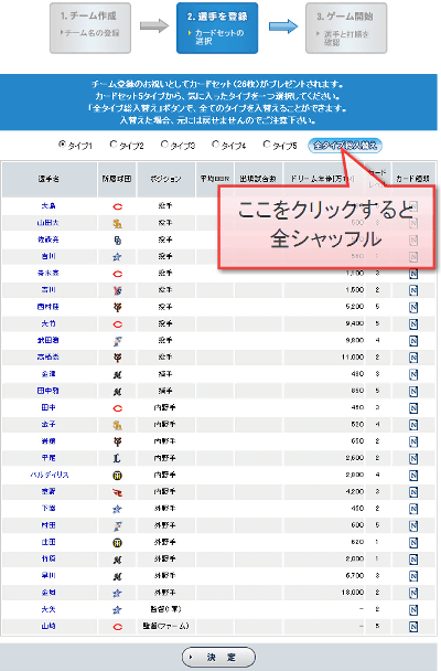 カードセットを一つ選択。どのタイプもちょっと……という時は「全タイプ総入れ替え」をクリックするとすべて入れ替えになります。これは気に入る組み合わせが出てくるまで何度でもシャッフル可能です。