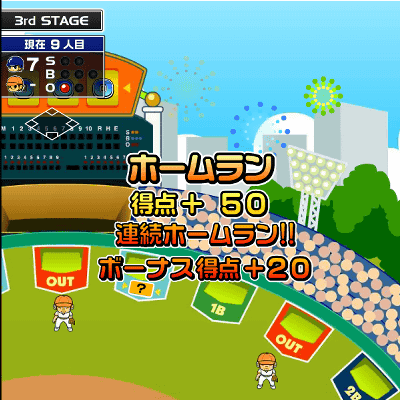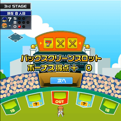 ホームランが出るとバックスクリーンにあるスロットが回ります。もし揃えば大きなボーナス点が入るかも……?