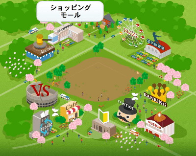 ゲームにログインしたところ。チーム編成やカード購入、対戦、トレードなどすべてのメニューがイラストで示されています。