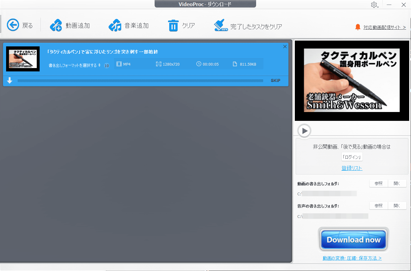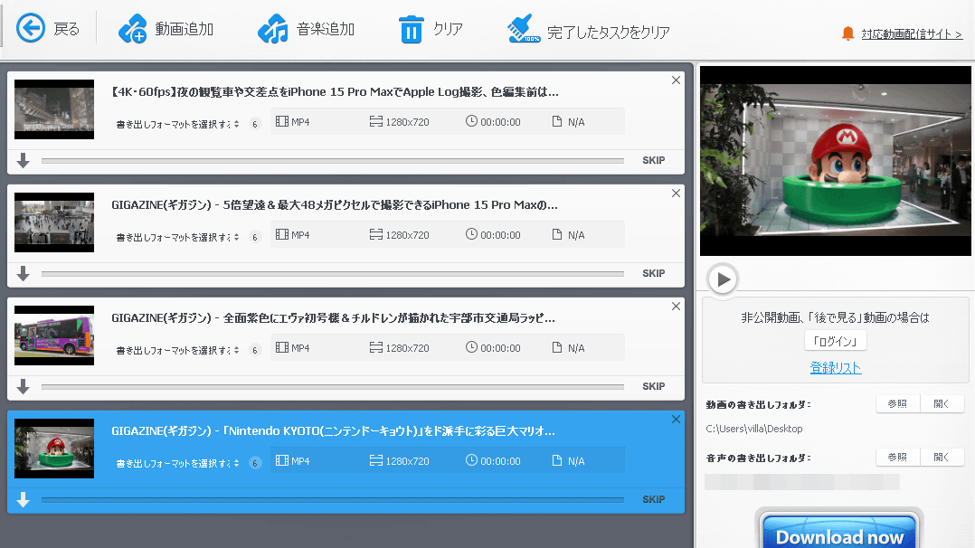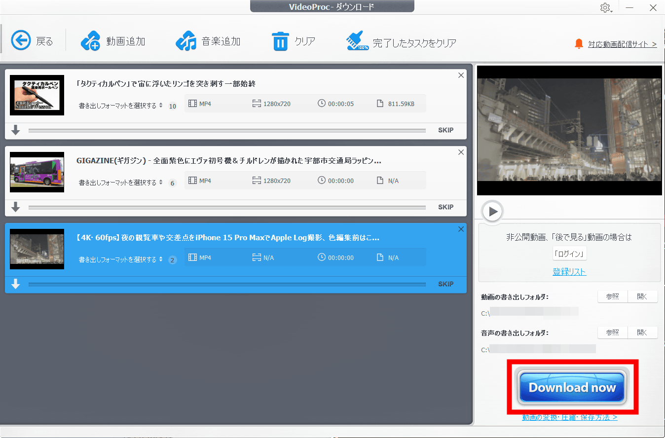 あとは「Download now」をクリックするだけで動画をダウンロードできます。動画を複数まとめて追加しておけば一括でダウンロード可能です。