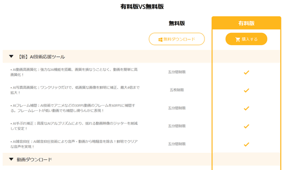 「VideoProc Converter AI」は無料でも利用できますが、無料版では各種AI機能の利用可能時間が制限されていたり、ダウンロード可能な動画の本数が10本に制限されていたり、動画を別のファイル形式に変換する際の機能が制限されていたり、画面録画に透かしが追加されたり、ファイルサイズを圧縮できるのが5分までだったりと、さまざまな制限が課せられます。それに対して、有料版だとAI機能は使い放題で、動画のダウンロード数も無制限です。