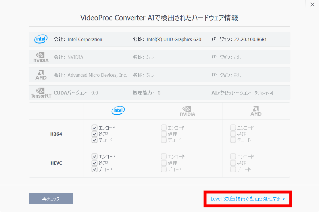 「Level-3加速技術で動画を処理する >」をクリック。