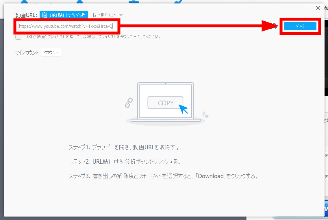 テキストボックスにダウンロードしたい動画のURLを入力し、「分析」をクリック。