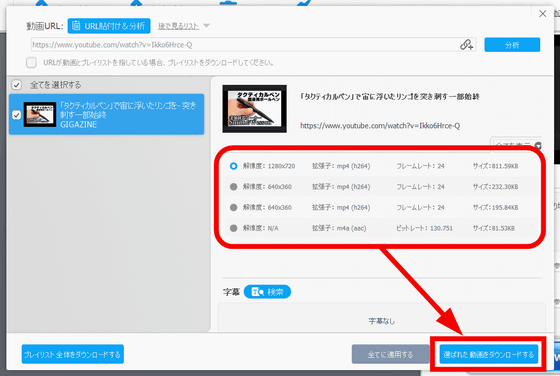 動画の解像度・拡張子・フレームレート・ビットレート・サイズを指定して、「選ばれた動画をダウンロード」をクリック。