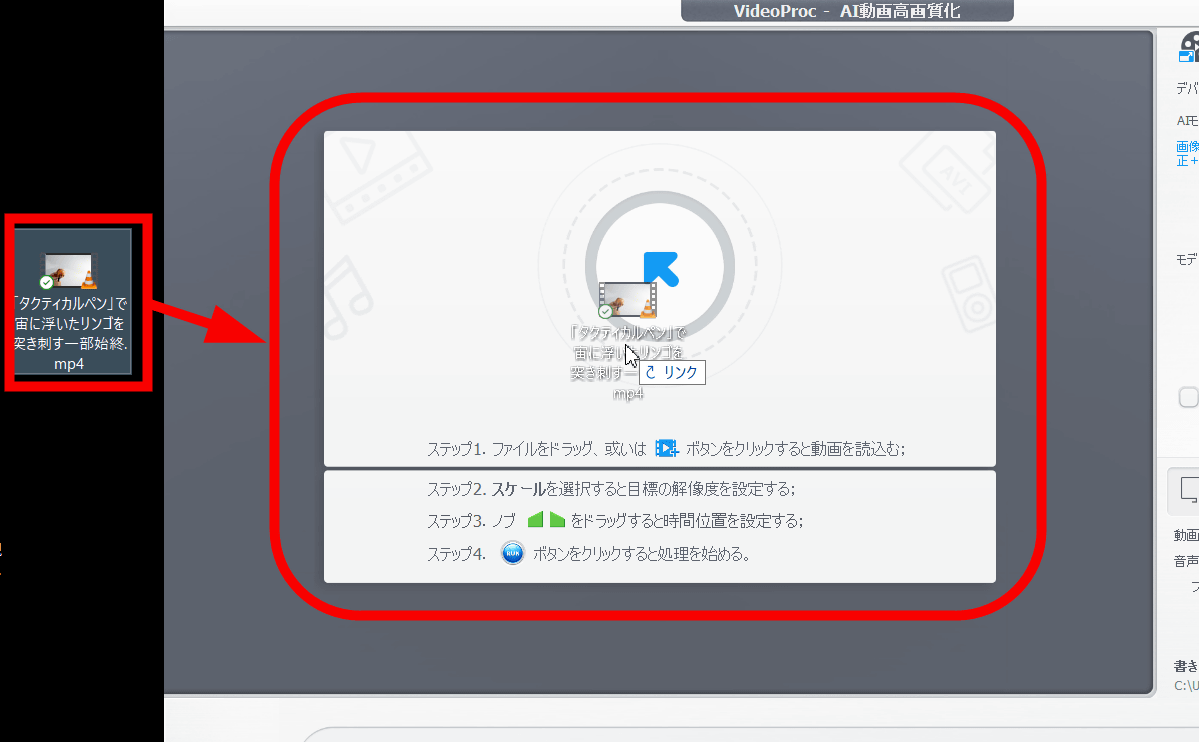 高画質化したい動画を赤枠部分にドラッグ&ドロップ。