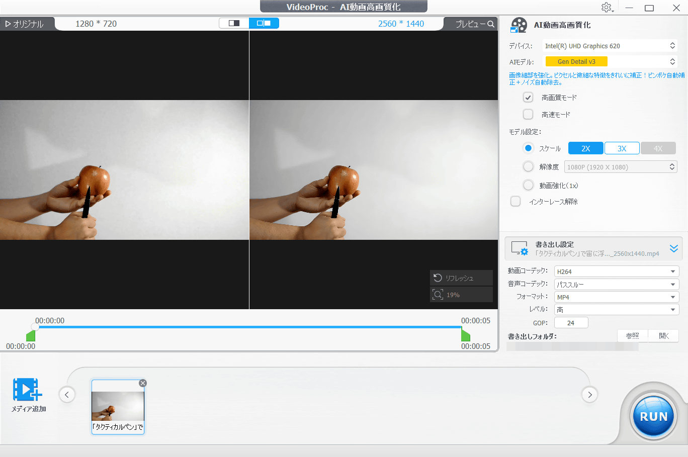 すると、オリジナルの動画が左に、高画質化後の動画が右に表示されます。変更できる設定は処理に使用する「デバイス」、高画質化を担当する「AIモデル」、動画をどれくらい高画質化するかに関する「モデル設定」、動画コーデックや音声コーデックやファイルフォーマットといった「書き出し設定」のみで、非常にシンプル。