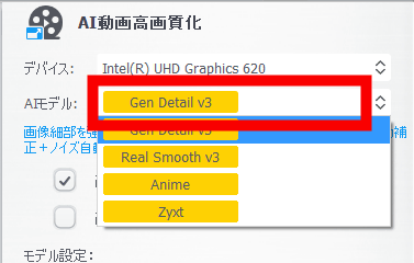 特に重要なのが動画の仕上がりに直結するAIモデルの選択。AIモデルはデフォルトだと「Gen Detail v3」が選択されていますが、どんな動画を高画質化するかによって選択すべきAIモデルは違ってきます。