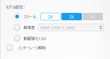 「モデル設定」では高画質化する動画の解像度を設定可能。「スケール」では元動画の何倍に解像度を向上させるか選択可能で、「解像度」から特定の解像度に指定することもできます。「動画強化(1x)」を選択すると解像度は元の動画のまま、鮮明さや明瞭さ、ディテールなどを向上させることが可能。「インターレース解除」を有効にすると、動画再生時に発生するコーミングノイズの原因であるインターレースを解除できます。