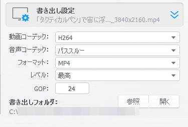 「書き出し設定」では、「動画コーデック」(H264/HEVC/AV1/ProRes)「音声コーデック」(パススルー/AAC)「フォーマット」(MP4/MKV/MOV)「レベル」(低/中/高/最高)「GOP」を設定可能。GOPはGroup of Picturesの略で、動画の圧縮率に関する設定。特に問題がなければデフォルト値のまま使用することが推奨されています。