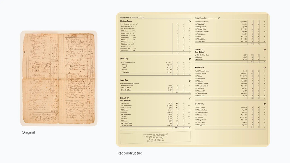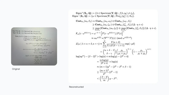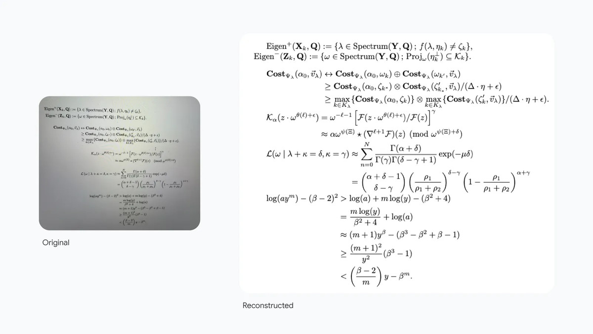 まず「文書理解」の分野では、Gemini 3 Proが読みにくい手書きの文章や入れ子になるようなテーブル構造、複雑な数学的表記、非線形レイアウトをHTMLやLaTeX、Markdownの構造化されたコードに再構築することが示されています。