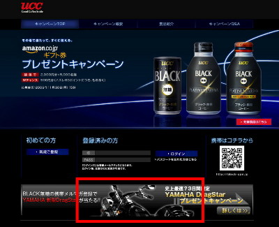 なお、Amazon®ギフト券のキャンペーンにはモバイル・パソコン両方から応募できるのですが、「YAMAHA XVS400 ドラッグスター」プレゼントへの応募はモバイルのみとなっています。まずは「UCC BLACK無糖」のモバイルサイトからメルマガ会員登録し、キャンペーン開始を通知するメールマガジンが配信されたら3日間以内に携帯電話から応募するという方式。