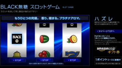 その場で当たりはずれがわかり、当選した場合はすぐに使えるAmazon®ギフト券番号が発行されるという方式。スロットゲームで同じ絵柄がそろえば当たりなのですが、今回はハズレでした。残念。