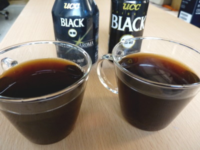 というわけで、せっかくなのでこの機会に3種の無糖缶コーヒーを飲み比べてみました。缶コーヒーの中の色を見ることはなかなかありませんが、グラスについでみるとこんな感じ。左が「BLACKプラチナアロマ」、右が「BLACK無糖」。