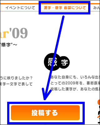 応募は簡単。上部に表示されているメニューから「漢字・感字応募について」をクリックし「投稿する」をクリック