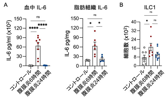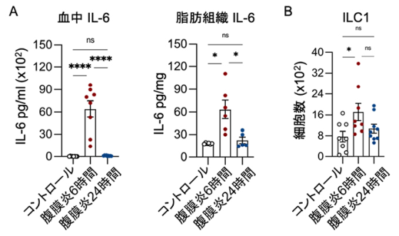 研究チームは、マウスの盲腸を縛って穴を開けるという敗血症の研究でもよく使われる手法で腹膜炎を引き起こし、内臓脂肪組織の働きを観察しました。その結果、炎症の強さを示す指標の一つであるIL-6が、血液中でも脂肪組織でも6時間後に増え、24時間後には腹膜炎誘導前と同程度まで下がったとのこと。また、炎症が強いこの時点では、脂肪組織の中でILC1が増えており、脾臓(ひぞう)から脂肪組織へ移動してきたことが示されました。研究チームは、腹膜炎の初期に内臓脂肪組織で免疫応答が起きていると考えています。