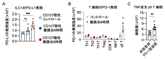 また、脂肪組織にいるガンマデルタT細胞では、免疫の働きを抑えるPD-1が減り、炎症を促すTNFは増えていました。また、TNFの働きを抑える薬を使うと、症状の改善も見られました。これらの結果から、研究チームは脂肪組織のILC1がガンマデルタT細胞を通じて過剰な炎症を抑え、腹膜炎が落ち着く過程に関わっている可能性が高いと考えています。