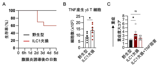 「CD127を持つILC1がPD-L1を通じてガンマデルタ細胞にブレーキをかけ、炎症が行き過ぎないようにしている」という考えが正しいかを確かめるため、研究チームはILC1を持たないマウスでも実験しました。すると、ILC1がないマウスでは炎症の強さを示す指標が増え、生存率も下がったとのことです。
