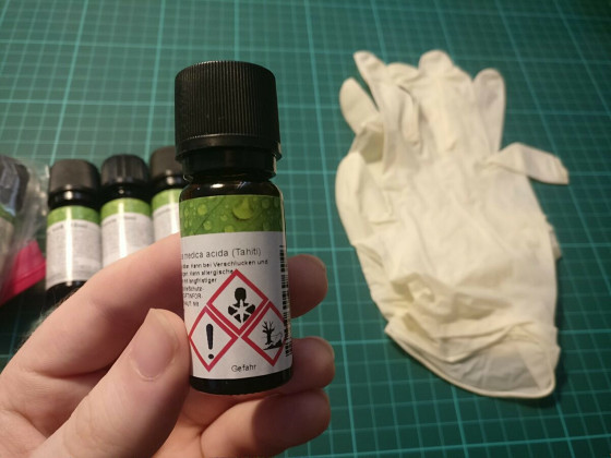 まずエッセンシャルオイルを小型シリンジなどで計量し、混ぜ合わせます。エッセンシャルオイルが皮膚に付着すると危険なので手袋を装着するといいそうです。