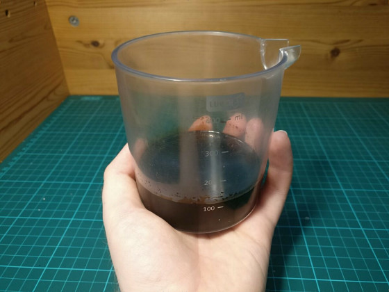 カラメル色素とクエン酸粉末も加えたら真っ黒なコーラ原液が完成。