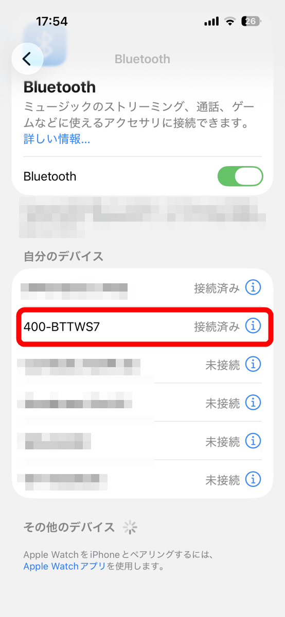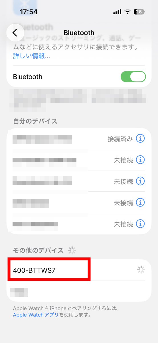 接続するデバイスでBluetoothの設定画面を開き、「400-BTTWS7」をタップ。