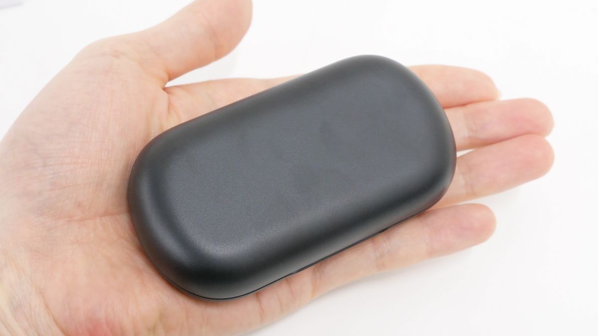 「400-BTTWS7」の充電ケースは小判型の平べったい形状で、サイズは横10.3cm×縦5.5cm×高さ2.6cm。手のひらに載せるとこんな感じです。