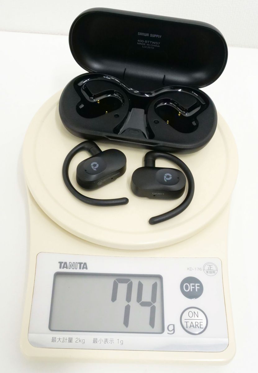 実際に「400-BTTWS7」で音楽を聴いてみたところ、普段カナル型イヤホンを使っていると耳穴への密着感のなさや音が響く位置に違和感を覚えるものの、しばらく聴いているとすぐに慣れました。低音や高音の響きにも問題はありません。カナル型イヤホンと違って耳穴がふさがらないので周囲の音もしっかり耳に届き、音楽を聴きながら外を歩いていても不安感がないのはうれしいポイントです。
