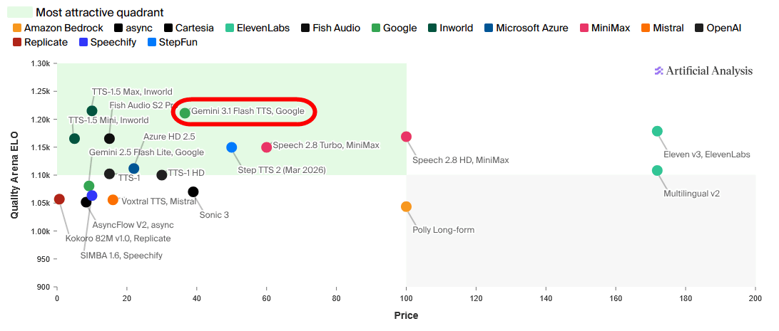 以下の図はArtificial Analysisが検証した各種音声合成AIのコストパフォーマンスを示したもので、横軸がAPI利用価格、縦軸が品質スコアを示しています。Gemini 3.1 Flash TTSが安価かつ高性能なモデルであることがよく分かります。
