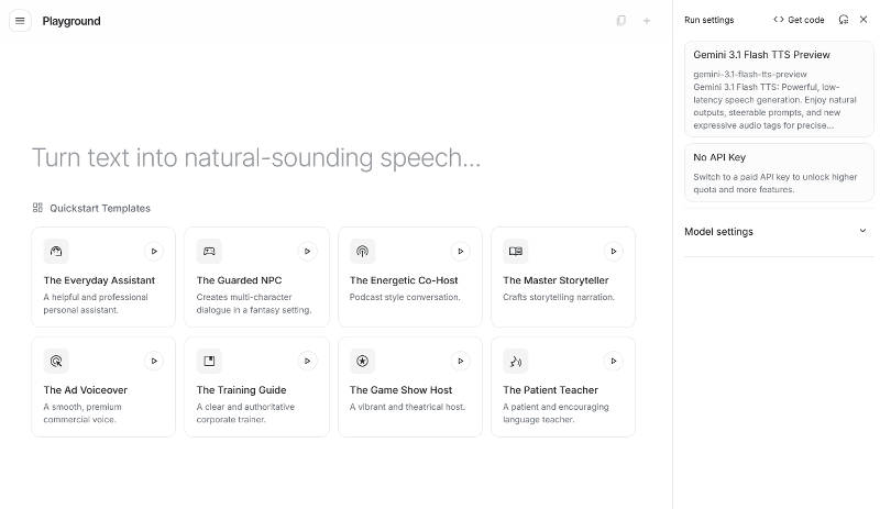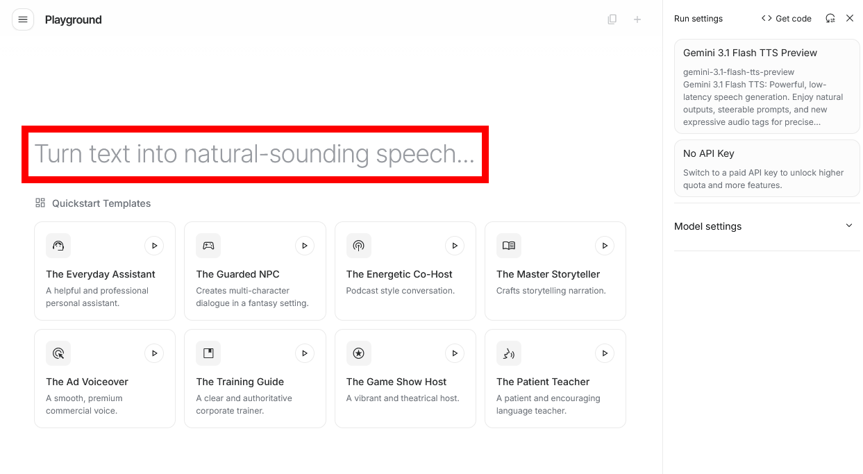 Gemini 3.1 Flash TTSを使える無料デモが公開されていたので、実際に音声を合成してみます。まず、以下のリンクをクリックしてデモサイトにアクセスします。