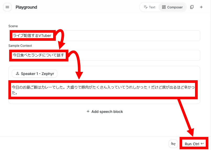 プロンプト入力画面が表示されたら上から順に「シーン」「文脈」「しゃべらせる内容」を入力して右下の実行ボタンをクリックします。