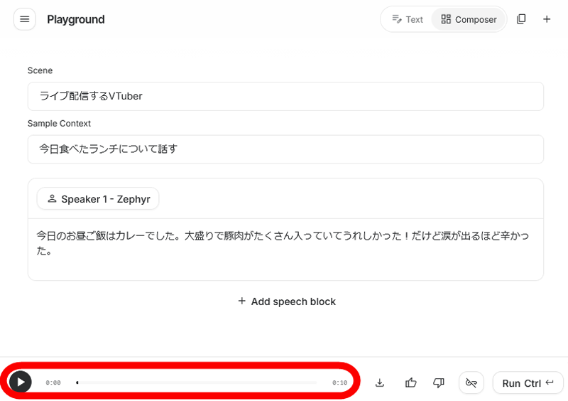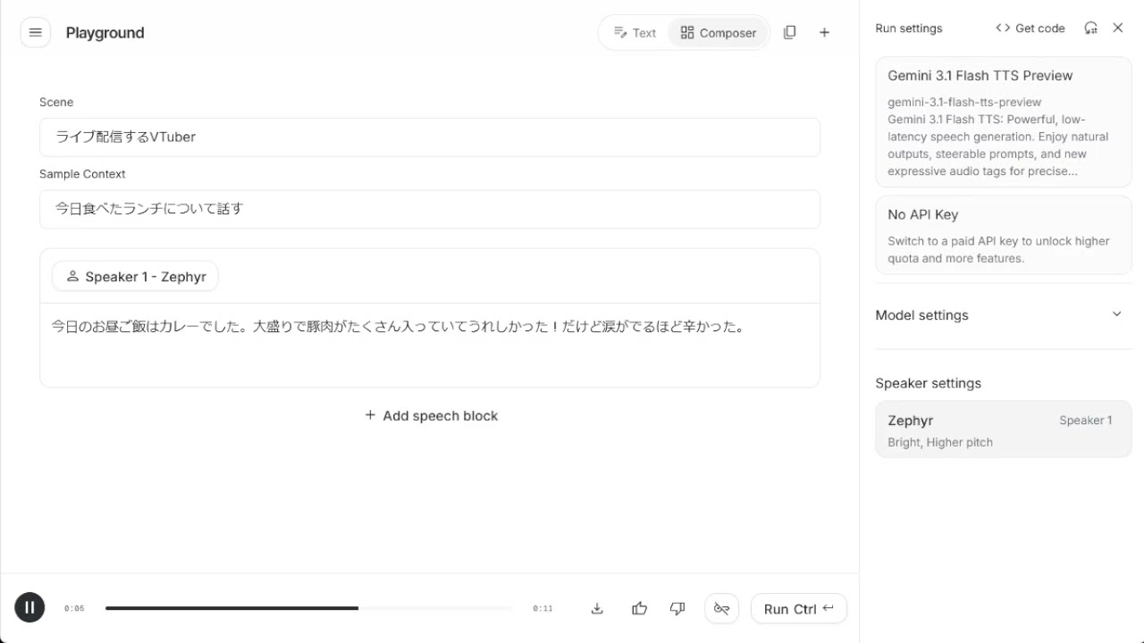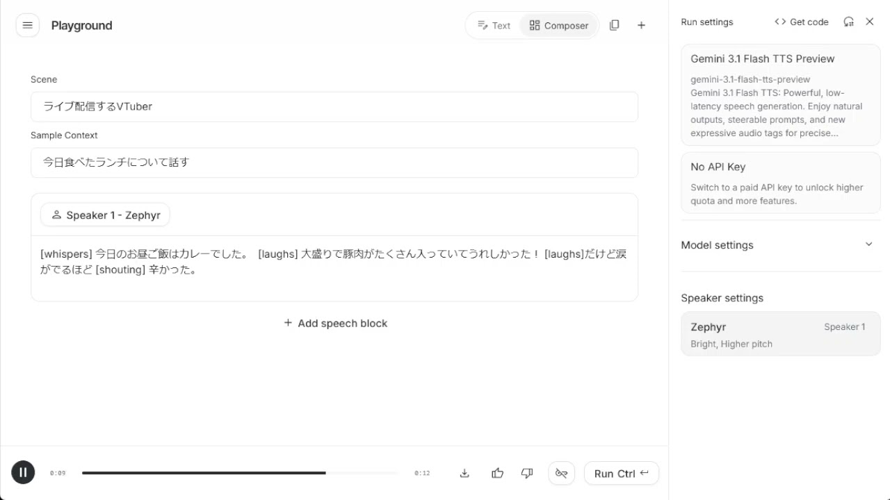 Googleが日本語対応の音声合成AI「Gemini 3.1 Flash TTS」をリリースしたので使ってみた、音声タグで感情を制御可能