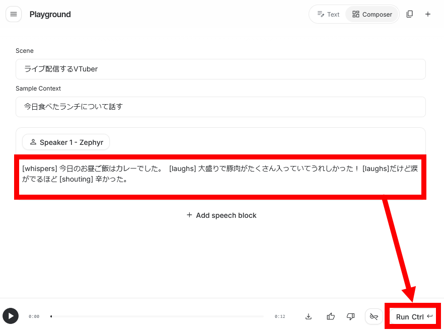 実際に「[whispers](ささやき)」「[laughs](笑い)」「[shouting](叫び)」という音声タグを追加して音声を合成してみます。