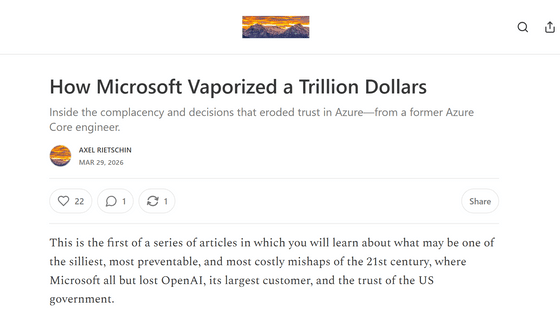 Microsoftが展開するクラウドサービスであるMicrosoft Azureのコアエンジニアだったアクセル・リーチン氏が、内部から見たMicrosoftの問題点をブログで告発しています。