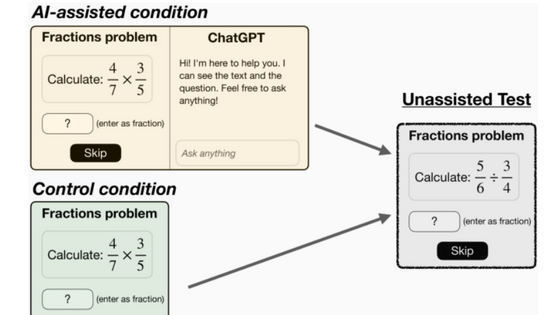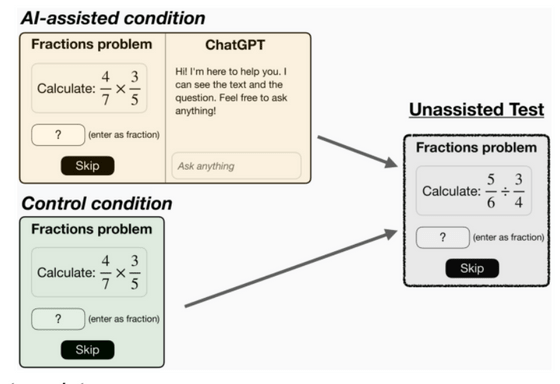 研究チームは354人の参加者を対象に、分数の計算問題を行わせる実験を行いました。参加者はランダムに「AI支援あり」「AI支援なし」の2つのグループに分けられ、「AI支援あり」のグループに割り振られた参加者はテスト問題の横でAIを利用する事が可能でした。