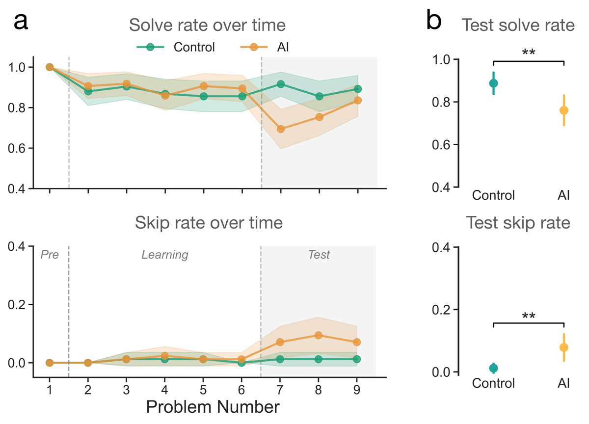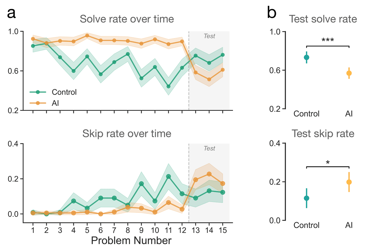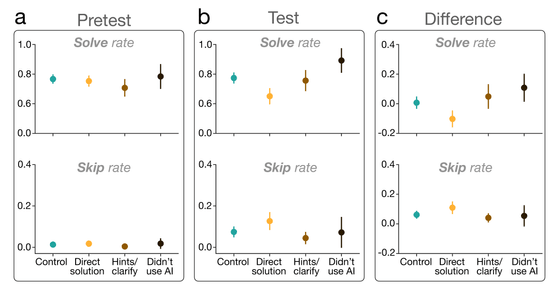 実験では合計15問の問題が出題され、だんだん難しくなる12問の問題を解いた後、「テスト」として3問の問題を解く構成でした。いつでも問題をスキップすることが可能だったほか、AIの支援を受けていたグループは「テスト」になると予告なくAIへアクセスできなくなる仕組みでした。