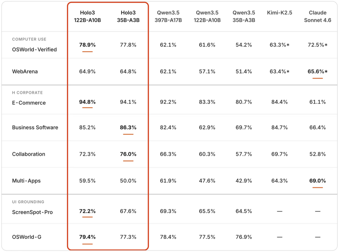 性能面ではオープンソース版のHolo3-35B-A3Bが国際標準ベンチマーク「OSWorld-Verified」で77.8%を記録しています。さらに、上位モデルのHolo3-122B-A10Bは同じベンチマークで78.85%を記録しています。なお、Holo3-122B-A10Bの総パラメーター数は1220億個で、動作時に使うアクティブパラメーター数は100億個です。